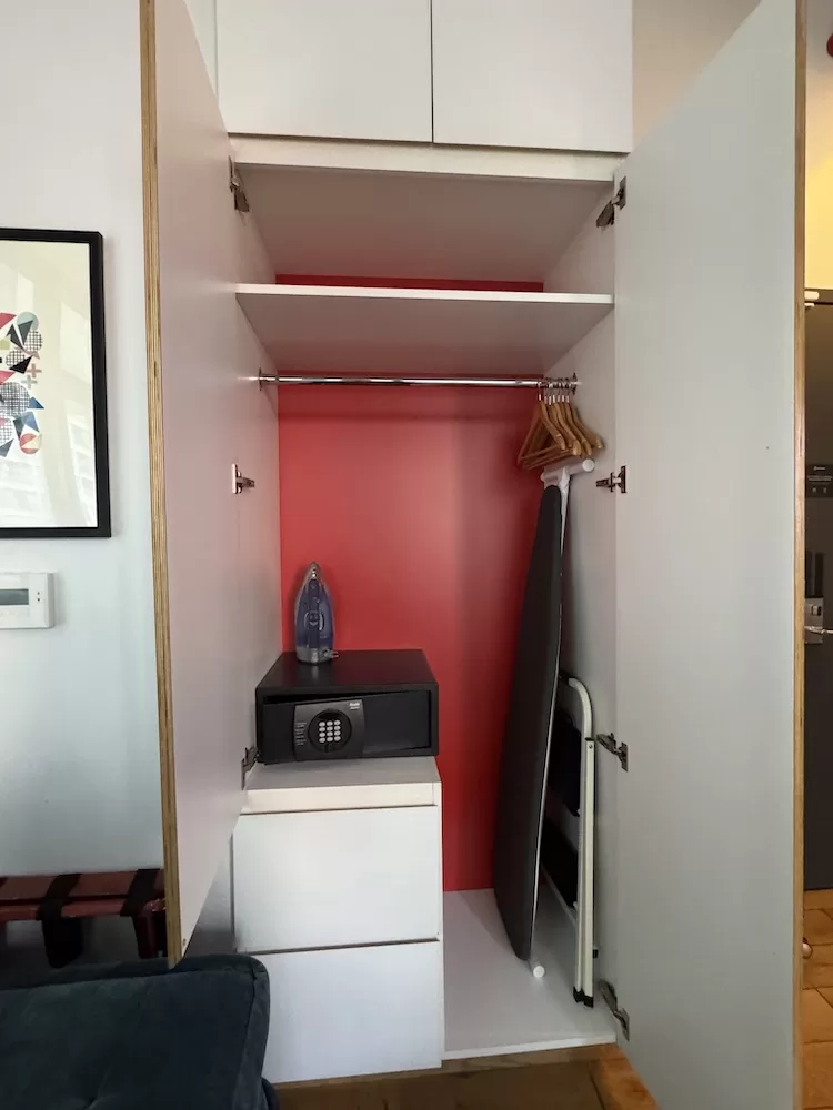 挺大的衣櫃,可以掛不少衣服,有熨板熨斗和保險箱。